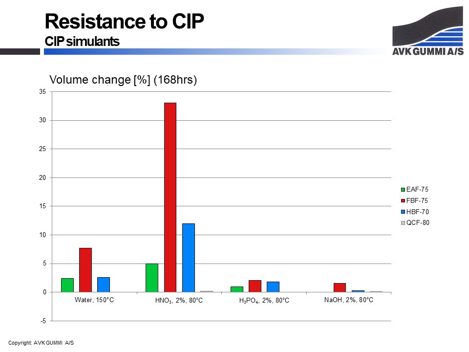 It goes without saying; if a rubber gasket is in contact with a medium that causes decomposition of the gasket, the lifetime will be reduced. However, it is all a little more complex when several media are involved. In order to be able to give you the best answer, most often we will carry out tests in the relevant products. An example could be food or cleaning chemicals that are often the main obstacles in the food industry. There are also a number of chemicals that represent a larger group of substances; simulants. Below is an example of four compounds used in the food industry. These compounds have been tested in chemicals that are typically used for cleaning the process equipment. As the cleaning takes place without dismantling the equipment, this process is called Clean in Place, or CIP.